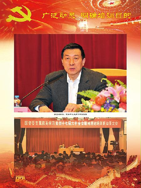 為深入學(xué)習(xí)貫徹黨的十七屆六中全會(huì)精神,研討進(jìn)一步落實(shí)“十二五”時(shí)期中央企業(yè)改革發(fā)展總體思路和國(guó)資監(jiān)管、國(guó)企發(fā)展“兩新目標(biāo)”,以及機(jī)關(guān)建設(shè)規(guī)劃綱要的思路和措施,同時(shí)梳理2011年的工作,研究2012年的工作,按照委國(guó)資委黨委的部署,11月15日至12月9日,國(guó)資委先后舉辦了4期學(xué)習(xí)貫徹六中全會(huì)精神理論培訓(xùn)班。國(guó)資委主任、黨委書(shū)記王勇親自為參加培訓(xùn)班的全體同志作動(dòng)員報(bào)告,并在第一期班暨黨委中心組學(xué)習(xí)會(huì)上作了總結(jié)講話。在京的國(guó)資委黨委委員、副秘書(shū)長(zhǎng),機(jī)關(guān)廳局長(zhǎng)、監(jiān)事會(huì)各辦事處主任和全體黨員干部以及直屬事業(yè)單位、管理局系統(tǒng)黨政領(lǐng)導(dǎo)班子成員、直管協(xié)會(huì)和部分京外企業(yè)在京單位黨組織負(fù)責(zé)同志共計(jì)1100余人參加了培訓(xùn),監(jiān)事會(huì)主席單獨(dú)進(jìn)行了培訓(xùn)。