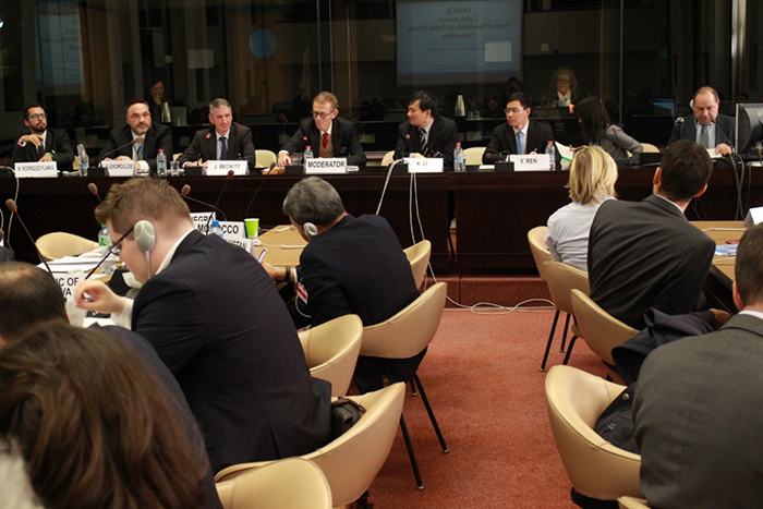 2016年10月20日﹒日內(nèi)瓦萬國宮,聯(lián)合國歐洲經(jīng)濟委員會PPP專家委員會會議:城市軌道交通PPP國際標準研究專家組長--中咨公司研究中心主任李開孟博士(左起第五)與鐵路PPP國際標準研究專家組長--CMS律師事務所英國總部PPP全球業(yè)務負責人Jonathan Beckitt(左起第三)在主席臺上。