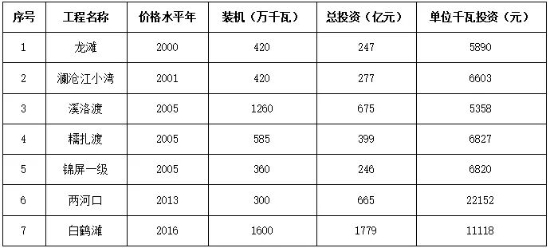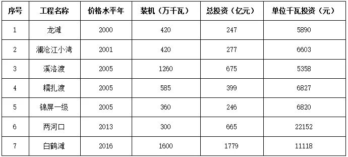 篩選我國2000年以來開工建設(shè)符合調(diào)節(jié)庫容≥50億立方米;調(diào)節(jié)性能≥年調(diào)節(jié);裝機規(guī)?!?00萬千瓦三個條件的水電站,工程投資情況見表1。