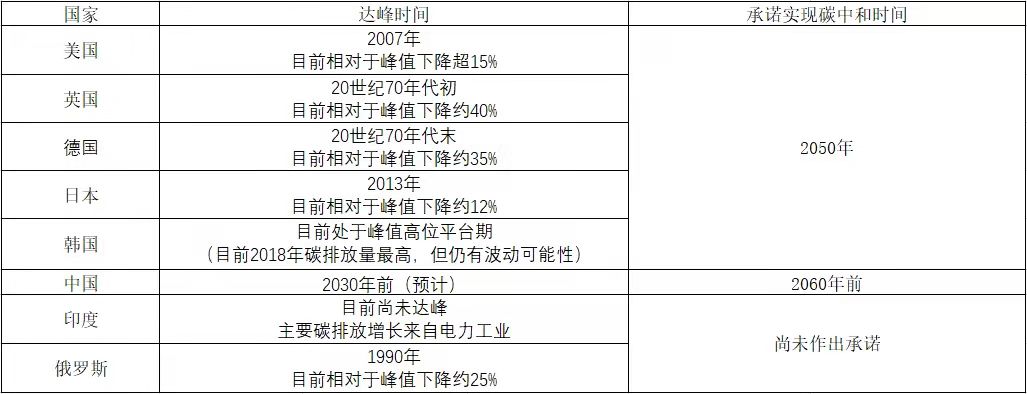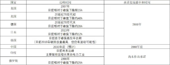 表1 各國(guó)碳排放達(dá)峰時(shí)間和承諾實(shí)現(xiàn)碳中和時(shí)間[4][5]