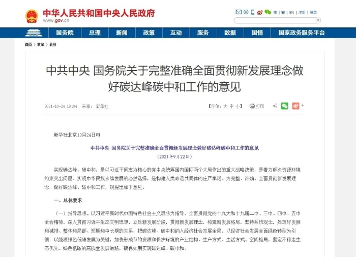 一年后,中共中央、國務院公布了一份重磅文件——《關于完整準確全面貫徹新發(fā)展理念做好碳達峰碳中和工作的意見》(以下簡稱《意見》)。