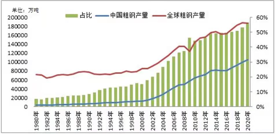 圖1 1980-2020年中國與世界粗鋼產(chǎn)量及其占比