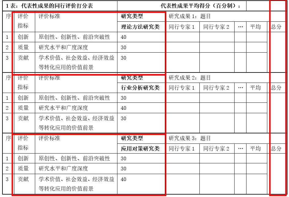 表1 代表性成果的百分制同行評(píng)價(jià)打分表(1表)
