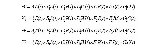 重大科技工程項目從項目立項到項目終止全壽命周期內(nèi),要按約定時間、成本、質(zhì)量完成預定的目標,同時政府機構、軍事機關、各軍兵種等管理主體,企事業(yè)單位、高等院校、軍事科研單位等實施主體,各經(jīng)濟和社會發(fā)展部門、各軍事作戰(zhàn)單位等使用主體各方須充分協(xié)同完成任務。因此,應密切關注項目成本、進度、質(zhì)量、協(xié)同等四大特征及項目綜合績效。由于七個維度要素變化對重大科技工程項目成本、質(zhì)量、進度、協(xié)同和綜合績效產(chǎn)生影響,且不同階段的影響程度不同,具有一定的關聯(lián)關系,分別表示為項目成本函數(shù)(PC)、項目質(zhì)量函數(shù)(PQ)、項目進度函數(shù)(PP)、項目協(xié)同函數(shù)(PS)。具體表示如下:
