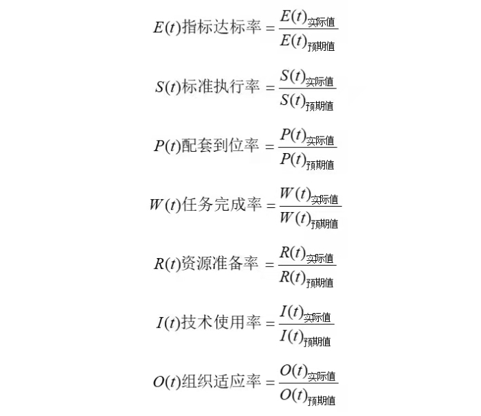 重大科技工程項目在全壽命周期內(nèi)七個維度基礎要素隨項目進展呈現(xiàn)動態(tài)變化,可分別表述為指標達標率、標準執(zhí)行率、配套到位率、任務完成率、資源準備率、技術使用率、組織適應率。而上述七個維度要素又包含若干子要素,具體可用實際發(fā)生的情況與項目階段目標的相對值測度。單個子要素測度函數(shù)如下: