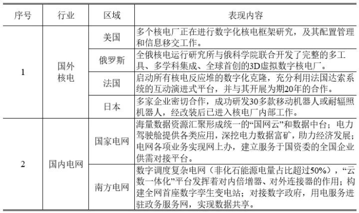 但應(yīng)看到,相比國(guó)際核電和國(guó)內(nèi)電網(wǎng)等行業(yè)的先進(jìn)代表[34-35](相關(guān)行業(yè)先進(jìn)代表相關(guān)調(diào)研內(nèi)容見(jiàn)表3),我國(guó)核電“數(shù)智化”在全域數(shù)據(jù)匯聚、電廠數(shù)據(jù)挖掘和融入對(duì)接外部“數(shù)智化”發(fā)展方面仍然存在不足。未來(lái)核電“數(shù)智化”應(yīng)致力在內(nèi)部打破行業(yè)及企業(yè)數(shù)據(jù)梗阻、推動(dòng)數(shù)字孿生技術(shù)在核電廠應(yīng)用、推動(dòng)全過(guò)程數(shù)字化移交、形成安全可靠統(tǒng)一的通用數(shù)據(jù)庫(kù)和各有特色的可調(diào)用專(zhuān)有數(shù)據(jù);在外部積極融入數(shù)字電網(wǎng)和對(duì)接數(shù)字政府等方面,解決核電已面臨或即將面臨的電力比重提高導(dǎo)致消納受限(沿海4個(gè)省份2021年核電電量占比已接近或超過(guò)20%)、常規(guī)的項(xiàng)目開(kāi)發(fā)模式對(duì)規(guī)劃裝機(jī)目標(biāo)完成支撐不足、在屬地化能源鏈中角色定位狹窄等問(wèn)題[36],以期相關(guān)內(nèi)容在短期內(nèi)能夠產(chǎn)生經(jīng)濟(jì)收益或管理效益。