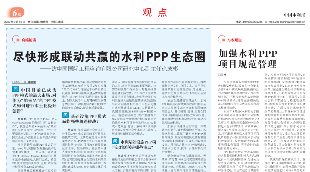 問:中國目前已成為PPP模式的最大市場,對作為“舶來品”的PPP模式如何進行本土化提升創(chuàng)新? 徐成彬:PPP是英文Public-Private—Partnership的縮寫,即“公私合作”。我國近年將PPP統(tǒng)稱為“政府和社會資本合作”,我國第一個“P”主要指政府,第二個“P”包含國有企業(yè)、民營企業(yè)、外商投資企業(yè)和混合所有制在內(nèi)的廣義資本方。 英國是最早采用PPP模式的國家。1992年,英國首創(chuàng)典型的政府付費類PPP模式——私人部門融資計劃(PFI,Private Finance Initiative),具體運作全部由私人部門完成。英國PFI項目主要涉及學校、醫(yī)院、政府辦公樓等社會基礎設施領域。 法國基礎設施和社會事業(yè)投資建設領域私有化程度相對較低,特許經(jīng)營類PPP模式是法國建設管理公共服務和基礎設施的普遍模式,幾乎所有的公共服務都向特許經(jīng)營者開放。法國水務集團早在十幾年前就登陸中國,開展了多個特許經(jīng)營水務項目。 目前,我國學者結(jié)合國情對PPP模式進行本土化提升創(chuàng)新,已總結(jié)提煉出“三代PPP”理論框架,即物有所值的“第一代PPP”(Value for Money)、經(jīng)濟價值的“第二代PPP”(Value for Economy)和以人為本的“第三代PPP”(Value for People)?!暗谝淮鶳PP”是將PPP作為政府采購公共服務的工具,其核心是要提高財政資金使用的質(zhì)量和效率,強調(diào)公共部門使用財政資金的物有所值;“第二代PPP”是將PPP作為促進經(jīng)濟發(fā)展的工具,強調(diào)PPP對經(jīng)濟發(fā)展的價值;“第三代PPP”是基于聯(lián)合國2030年可持續(xù)發(fā)展目標(SDGs),將PPP作為實現(xiàn)以人為本可持續(xù)發(fā)展目標的工具,強調(diào)PPP對人類的價值。 三代PPP模式之間,存在遞次迭代及演進關系。我國應通過全面完善“第一代PPP”,將“利益共享、風險共擔、平等合作”的現(xiàn)代PPP理念導入基礎設施及公共服務領域;通過價格和收費制度的改革,推動使用者付費類基礎設施市場化改革,大力發(fā)展“第二代PPP”,可通過不動產(chǎn)投資信托基金(REITs)等模式盤活優(yōu)質(zhì)存量資產(chǎn);在PPP制度不斷完善的基礎上,在以人民為中心及可持續(xù)發(fā)展理念的引領下,積極推動“第三代PPP”的制度體系建設,促進高質(zhì)量發(fā)展。 問:基礎設施PPP模式面臨哪些機遇挑戰(zhàn)? 徐成彬:作為撬動社會資本的一種手段,PPP模式是目前不可替代的穩(wěn)投資方式。尤其是在盤活水利存量資產(chǎn)方面,PPP模式可以實現(xiàn)水利項目經(jīng)營權轉(zhuǎn)換、項目改擴建及提高運營水平。鼓勵和吸引社會資本進入重大水利項目,既可以補充水利基建項目的資金需求,推動擴大有效投資;也可以通過建立合理的水利項目回報機制,讓社會資本參與水利工程項目建設和運營,穩(wěn)定市場主體的投資預期。 近年來通過持續(xù)的項目實踐以及國家相關部門的政策引導與市場監(jiān)管,目前PPP項目的規(guī)范化運作已得到較大改善,新增PPP項目涉及隱性債務的風險管理能力得到了提升。目前,所有PPP項目都要求開展可行性論證,履行審批、核準或備案法定程序;嚴格識別PPP項目可能涉及的固定回報、明股實債、承諾回購等隱性債務風險,并將新增純政府付費項目的紅線從10%進一步壓縮至5%,增加了風險的可控性。 我國自1995年開展BOT試點,特別是2014年大規(guī)模推行PPP模式以來,在水利等基礎設施領域沉淀了規(guī)模巨大的存量資產(chǎn)。我國“十四五”規(guī)劃和2035年遠景目標綱要明確指出,通過規(guī)范有序推進PPP,推動基礎設施REITs健康發(fā)展,以有效盤活存量資產(chǎn),形成存量資產(chǎn)和新增投資的良性循環(huán)。今年5月國務院辦公廳發(fā)布《關于進一步盤活存量資產(chǎn)擴大有效投資的意見》,鼓勵具備長期穩(wěn)定經(jīng)營性收益的存量項目采用PPP模式盤活存量資產(chǎn),提升運營效率和服務水平。由此可見,PPP在盤活存量資產(chǎn)方面大有可為。 水利PPP項目如何吸引民間資本進入、如何在融資方面找到更靈活的辦法,是當前面臨的一個重要問題。這需要相關部門探索加大對有效投資等金融支持力度。2021年7月國家發(fā)展改革委已將具有供水、發(fā)電等功能的水利設施納入基礎設施領域試點范圍;當前水利部及相關部門正在大力推廣水利基礎設施REITs,應將其納入我國基礎設施REITs統(tǒng)一框架體系。通過項目篩選、資產(chǎn)重組等工作,探索將投資管理合規(guī)、收益穩(wěn)定的優(yōu)質(zhì)水利項目率先發(fā)行REITs,形成示范效應,有助于解決PPP項目融資難題,可為社會資本注入“活水”,形成良性循環(huán)的運作模式。 問:水利基礎設施PPP項目操作需關注哪些重點? 徐成彬:《水利部關于推進水利基礎設施政府和社會資本合作(PPP)模式發(fā)展的指導意見》指出,水利基礎設施PPP將聚焦國家水網(wǎng)重大工程、水資源集約節(jié)約利用、農(nóng)村供水工程建設、流域防洪工程體系建設、河湖生態(tài)保護修復、智慧水利建設等六大重點領域。 基礎設施領域PPP項目周期一般包括項目儲備、項目論證、合作伙伴選擇及項目執(zhí)行等階段,每個階段涉及多項步驟。具體到水利基礎設施PPP項目操作,需要關注以下重點。 一是深化項目前期論證工作。重大水利工程前期工作技術復雜、不確定性因素多、周期長,
