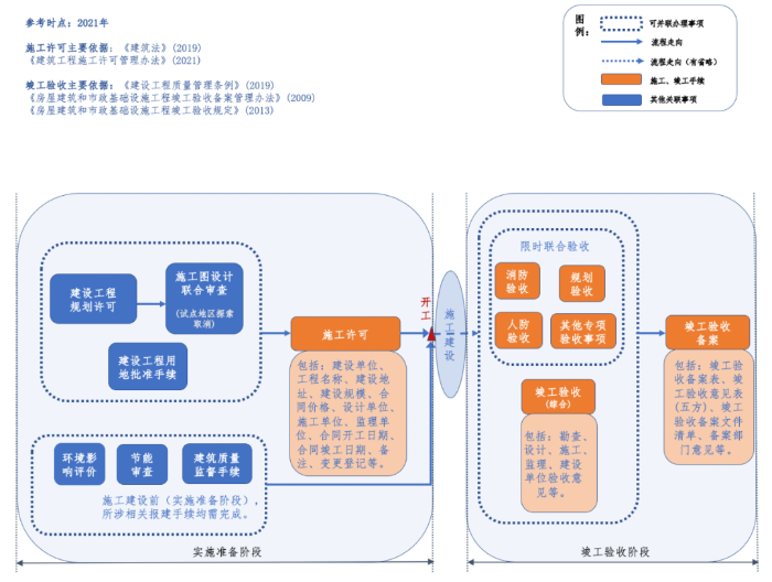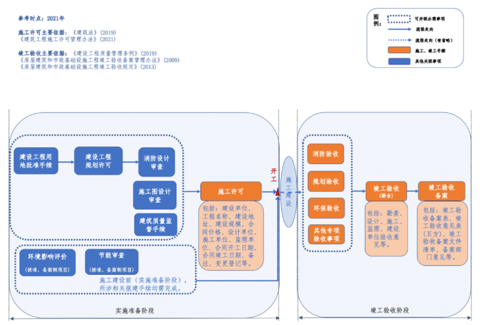 編者按 新中國(guó)成立以來(lái),我國(guó)基礎(chǔ)設(shè)施投資建設(shè)取得了舉世矚目的成就,是國(guó)家經(jīng)濟(jì)社會(huì)發(fā)展的重要支撐,為人民生活水平的提高做出了巨大貢獻(xiàn)。改革開放以來(lái),市場(chǎng)開始發(fā)揮配置資源的決定性作用,為我國(guó)基礎(chǔ)設(shè)施的發(fā)展煥發(fā)了新的活力。據(jù)統(tǒng)計(jì),我國(guó)基礎(chǔ)設(shè)施資產(chǎn)總規(guī)模在1990年排在全世界約第15位,2000年上升到第7位,2010年躍升為第3位,至2018年已居世界首位。 黨的二十大報(bào)告在回顧過(guò)去五年的工作和新時(shí)代十年的偉大變革中,充分肯定了基礎(chǔ)設(shè)施在經(jīng)濟(jì)社會(huì)中發(fā)揮的重要作用。報(bào)告指出,我國(guó)“建成世界最大的高速鐵路網(wǎng)、高速公路網(wǎng),機(jī)場(chǎng)港口、水利、能源、信息等基礎(chǔ)設(shè)施建設(shè)取得重大成就”。我國(guó)基礎(chǔ)設(shè)施多年來(lái)大規(guī)模的投資建設(shè)和存量資產(chǎn)的高速積累,是黨中央、國(guó)務(wù)院在建立社會(huì)主義市場(chǎng)經(jīng)濟(jì)體制背景下,關(guān)于投融資體制改革部署的重要成果。 項(xiàng)目前期工作手續(xù)的合規(guī)性要求,是基礎(chǔ)設(shè)施能夠發(fā)揮其應(yīng)有價(jià)值的重要前提,也是投融資體制改革關(guān)注的重點(diǎn)內(nèi)容之一。伴隨著政府職能轉(zhuǎn)變、深化“放管服”改革和擴(kuò)大有效投資等重大決策的關(guān)鍵部署,我國(guó)工程建設(shè)項(xiàng)目審批制度不斷優(yōu)化和改革,基礎(chǔ)設(shè)施項(xiàng)目投資前期決策管理經(jīng)歷了復(fù)雜的演變進(jìn)程,其合規(guī)性標(biāo)準(zhǔn)也在與時(shí)俱進(jìn)、不斷完善。當(dāng)前我國(guó)已進(jìn)入基礎(chǔ)設(shè)施存量時(shí)代,存量資產(chǎn)項(xiàng)目前期工作手續(xù)的合規(guī)性是重要的盤活條件之一,部分合規(guī)性問(wèn)題已成為新時(shí)代社會(huì)廣泛關(guān)注的焦點(diǎn)。本項(xiàng)專題研究立足投融資體制和項(xiàng)目審批制度變革的歷史背景,嘗試?yán)迩寤A(chǔ)設(shè)施項(xiàng)目在立項(xiàng)、土地、規(guī)劃、環(huán)境、建設(shè)施工等方面主要前期工作的歷史變革脈絡(luò),梳理不同管理事項(xiàng)之間的邏輯關(guān)聯(lián),從這一視角提供基礎(chǔ)設(shè)施項(xiàng)目前期工作手續(xù)的合規(guī)性認(rèn)識(shí)。本公眾號(hào)將研究報(bào)告的部分成果以系列文章的形式陸續(xù)刊發(fā),研究報(bào)告第一部分為背景與立項(xiàng)篇,第二部分為土地與規(guī)劃篇,本文是系列研究報(bào)告的第三部分(建設(shè)施工篇),供業(yè)界同仁參考。 基礎(chǔ)設(shè)施項(xiàng)目前期工作手續(xù)合規(guī)性研究(Ⅲ) 張雪飛 伍迪 摘要:開工和竣工是基礎(chǔ)設(shè)施項(xiàng)目建設(shè)施工方面的重要工作節(jié)點(diǎn),依法合規(guī)開展有關(guān)工作是項(xiàng)目的合規(guī)性前提。建筑工程施工許可證(或開工報(bào)告)是建筑施工單位符合施工條件、允許開工的批準(zhǔn)文件,是建設(shè)單位進(jìn)行工程施工的法律憑證,是工程項(xiàng)目由實(shí)施準(zhǔn)備轉(zhuǎn)向施工建設(shè)、由藍(lán)圖設(shè)計(jì)變成項(xiàng)目實(shí)體的重要工作手續(xù)。竣工驗(yàn)收是建設(shè)工程項(xiàng)目竣工后,全面考核建設(shè)工作、檢查是否符合設(shè)計(jì)要求和工程質(zhì)量的重要環(huán)節(jié),是工程項(xiàng)目由施工建設(shè)走向運(yùn)營(yíng)投產(chǎn),是建設(shè)投資成果轉(zhuǎn)入交付使用的關(guān)鍵工作事項(xiàng)。本文聚焦基礎(chǔ)設(shè)施項(xiàng)目建設(shè)施工方面的手續(xù),尤其對(duì)施工許可和竣工驗(yàn)收兩方面的主要內(nèi)容和制度演進(jìn)進(jìn)行系統(tǒng)梳理,供業(yè)界參考。 關(guān)鍵詞:基礎(chǔ)設(shè)施;合規(guī)性;施工許可;竣工驗(yàn)收;政策演進(jìn) 一、施工許可手續(xù)合規(guī)性 (一)內(nèi)涵與適用范圍 建筑工程施工許可證是建筑施工單位符合施工條件、允許開工的批準(zhǔn)文件,是建設(shè)單位進(jìn)行工程施工的法律憑證。根據(jù)有關(guān)法律政策規(guī)定,在中華人民共和國(guó)境內(nèi)從事各類房屋建筑及其附屬設(shè)施的建造、裝修裝飾和與其配套的線路、管道、設(shè)備的安裝,以及城鎮(zhèn)市政基礎(chǔ)設(shè)施工程的施工,建設(shè)單位在開工前應(yīng)當(dāng)向工程所在地縣級(jí)以上人民政府建設(shè)行政主管部門申請(qǐng)領(lǐng)取施工許可證,國(guó)務(wù)院建設(shè)行政主管部門確定的限額以下的小型工程除外。具體而言,對(duì)于工程投資額在30萬(wàn)元以下或者建筑面積在300平方米以下的建筑工程,可以不申請(qǐng)辦理施工許可證。各省、自治區(qū)、直轄市人民政府住房城鄉(xiāng)建設(shè)主管部門可以根據(jù)當(dāng)?shù)氐膶?shí)際情況,對(duì)限額進(jìn)行調(diào)整,并報(bào)國(guó)務(wù)院住房城鄉(xiāng)建設(shè)主管部門備案。按照國(guó)務(wù)院規(guī)定的權(quán)限和程序批準(zhǔn)開工報(bào)告的建筑工程,不再領(lǐng)取施工許可證。 辦理施工許可證有關(guān)事項(xiàng)應(yīng)主要以《中華人民共和國(guó)建筑法》(以下簡(jiǎn)稱《建筑法》)和《建筑