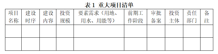 ——重大項(xiàng)目清單。包括項(xiàng)目名稱、建設(shè)時(shí)序、建設(shè)內(nèi)容、投資規(guī)模、要素需求(用地、用海、用水、用能、排放等)、前期工作階段、審批備案、投資主體、責(zé)任部門以及備注等內(nèi)容。其中,主要建設(shè)內(nèi)容是指項(xiàng)目建設(shè)的主要產(chǎn)品或服務(wù)、規(guī)模,前期工作階段是指項(xiàng)目處于篩選、項(xiàng)目建議書、可行性研究哪個(gè)階段,是否完成相應(yīng)階段研究任務(wù);項(xiàng)目是否通過政府相關(guān)部門審批或備案,是否通過項(xiàng)目選址以及用海、用能、安全評價(jià)等預(yù)審。