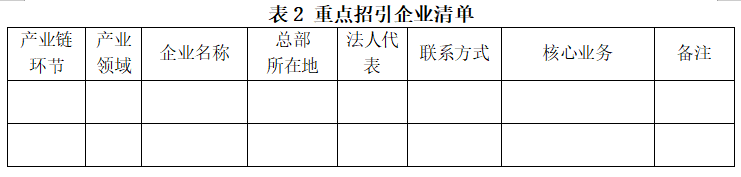 ——重點(diǎn)招引企業(yè)清單。包括產(chǎn)業(yè)鏈環(huán)節(jié)、產(chǎn)業(yè)領(lǐng)域、企業(yè)名稱、總部所在地、法人代表、聯(lián)系方式、核心業(yè)務(wù)以及備注等內(nèi)容。產(chǎn)業(yè)鏈環(huán)節(jié)一般由上游、中游和下游組成,具體包括以下細(xì)分環(huán)節(jié):原材料采購環(huán)節(jié)、生產(chǎn)環(huán)節(jié)、加工環(huán)節(jié)、銷售與營銷環(huán)節(jié)、物流與配送環(huán)節(jié)、售后服務(wù)環(huán)節(jié)、回收與再利用環(huán)節(jié)、研發(fā)與創(chuàng)新環(huán)節(jié)。不同行業(yè)和不同產(chǎn)品的產(chǎn)業(yè)鏈可能會(huì)有所不同,也可能會(huì)有其他環(huán)節(jié),但以上八個(gè)環(huán)節(jié)是產(chǎn)業(yè)鏈的主要組成部分。產(chǎn)業(yè)領(lǐng)域按生產(chǎn)活動(dòng)的性質(zhì)及其產(chǎn)品屬性對產(chǎn)業(yè)進(jìn)行分類。其中,按生產(chǎn)活動(dòng)性質(zhì),把產(chǎn)業(yè)部門分為物質(zhì)資料生產(chǎn)部門和非物質(zhì)資料生產(chǎn)部門兩大領(lǐng)域,前者指從事物質(zhì)資料生產(chǎn)并創(chuàng)造物質(zhì)產(chǎn)品的部門,包括農(nóng)業(yè)、工業(yè)、建筑業(yè)、運(yùn)輸郵電業(yè)、商業(yè)等;后者指不從事物質(zhì)資料生產(chǎn)而只提供非物質(zhì)性服務(wù)的部門,包括科學(xué)、文化、教育、衛(wèi)生、金融、保險(xiǎn)、咨詢等部門。與此同時(shí),按照GB/T 4754-2017《國民經(jīng)濟(jì)行業(yè)分類》要求,行業(yè)分類共有20個(gè)門類、97個(gè)大類、473個(gè)中類、1380個(gè)小類。其中,第一產(chǎn)業(yè)是指農(nóng)、林、牧、漁業(yè)。第二產(chǎn)業(yè)是指采礦業(yè),制造業(yè),電力、燃?xì)饧八纳a(chǎn)和供應(yīng)業(yè),建筑業(yè)。第三產(chǎn)業(yè)包括:交通運(yùn)輸、倉儲(chǔ)和郵政業(yè),信息傳輸、計(jì)算機(jī)服務(wù)和軟件業(yè),批發(fā)和零售業(yè),住宿和餐飲業(yè),金融業(yè),房地產(chǎn)業(yè),租賃和商務(wù)服務(wù)業(yè),科學(xué)研究、技術(shù)服務(wù)和地質(zhì)勘查業(yè),水利、環(huán)境和公共設(shè)施管理業(yè),居民服務(wù)和其他服務(wù)業(yè),教育,衛(wèi)生、社會(huì)保障和社會(huì)福利業(yè),文化、體育和娛樂業(yè),公共管理和社會(huì)組織,國際組織。核心業(yè)務(wù)指一個(gè)多元化經(jīng)營的企業(yè)或企業(yè)集團(tuán)中具有競爭優(yōu)勢并能夠帶來主要利潤收入的業(yè)務(wù)。