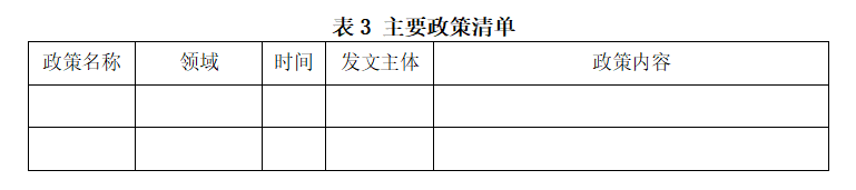 ——主要政策清單。相關(guān)方通過全面梳理某領(lǐng)域政策,調(diào)度匯總相關(guān)政策,形成政策清單,政策清單作為推進(jìn)經(jīng)濟(jì)社會(huì)高質(zhì)量發(fā)展的工具箱,即為政府、企業(yè)等對相關(guān)領(lǐng)域政策體系的整體了解把握提供了依據(jù),也為相關(guān)方就下一步發(fā)展方向、重大項(xiàng)目謀劃等工作提供了支撐,其包括政策名稱、領(lǐng)域、時(shí)間、發(fā)文主體和政策內(nèi)容等。