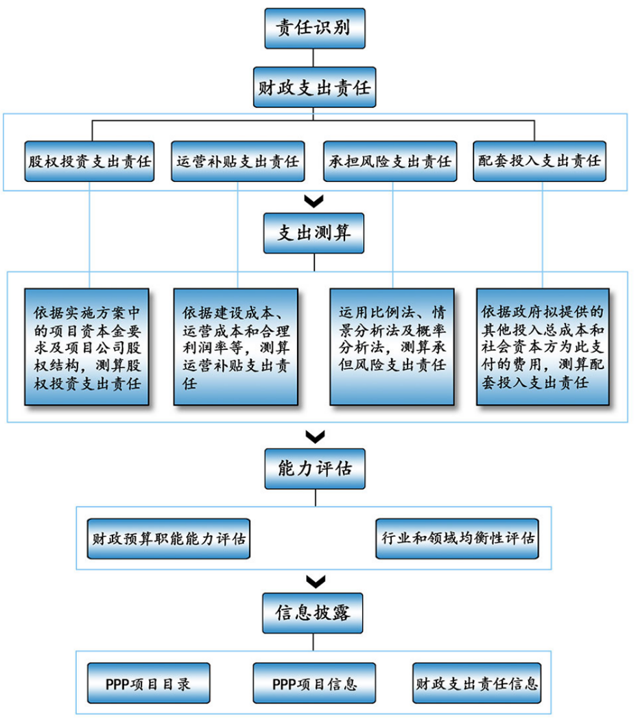——財(cái)政承受能力論證。財(cái)政承受能力論證是指識(shí)別、測算PPP項(xiàng)目的各項(xiàng)財(cái)政支出責(zé)任,科學(xué)評估項(xiàng)目實(shí)施對當(dāng)前及今后年度財(cái)政支出的影響,為PPP項(xiàng)目財(cái)政管理提供依據(jù)。項(xiàng)目基礎(chǔ)信息、責(zé)任識(shí)別(股權(quán)投資支出責(zé)任、運(yùn)營補(bǔ)貼支出責(zé)任、承擔(dān)風(fēng)險(xiǎn)支出責(zé)任、配套投入支出責(zé)任)、財(cái)政承受能力論證(財(cái)政支出責(zé)任識(shí)別及測算、財(cái)政承受能力評估、地方政府債務(wù)影響評估、行業(yè)和領(lǐng)域均衡性影響評估)。財(cái)政承受能力論證工作流程如下圖所示。