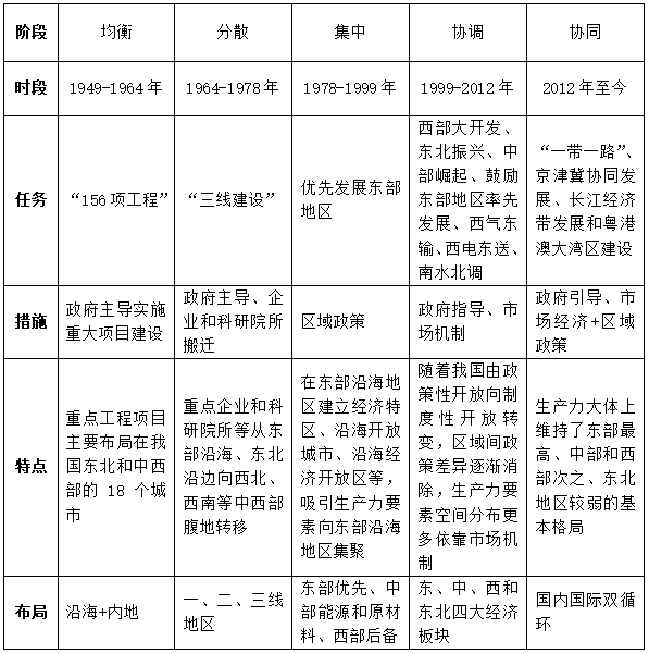 新中國(guó)成立初期,我國(guó)經(jīng)濟(jì)建設(shè)經(jīng)驗(yàn)并不充足,在沒(méi)有太多實(shí)踐的基礎(chǔ)上,為了加快提升經(jīng)濟(jì)總量迅速開(kāi)始探索開(kāi)展生產(chǎn)力布局的嘗試。總體上經(jīng)歷了“相對(duì)均衡—有所分散—相對(duì)集中—趨于協(xié)調(diào)—注重協(xié)同”五?次重大調(diào)整階段,從而對(duì)我國(guó)區(qū)域開(kāi)發(fā)格局和經(jīng)濟(jì)格局產(chǎn)生了重要影響,奠定了我國(guó)經(jīng)濟(jì)總體持續(xù)穩(wěn)定增長(zhǎng)的基礎(chǔ),形成了門(mén)類齊全的工業(yè)產(chǎn)業(yè)體系。相關(guān)情況如下表: