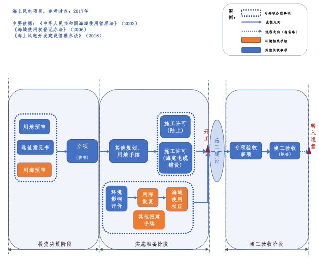 對于特定行業(yè)或特殊性質(zhì)的基礎(chǔ)設(shè)施項目,項目需依法依規(guī)辦理海域使用、電信業(yè)務(wù)經(jīng)營許可、外商投資安全審查等重要手續(xù)。因各行業(yè)之間差異較大,現(xiàn)以海上風(fēng)電項目為例,梳理投資管理手續(xù)脈絡(luò)。