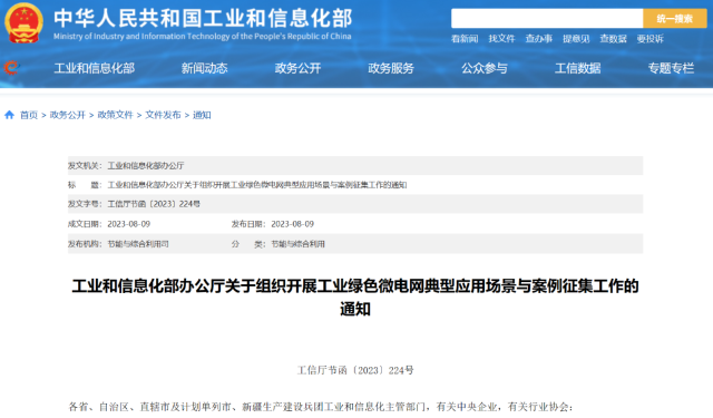 2023年8月9日,工業(yè)和信息化部發(fā)布《關(guān)于組織開展工業(yè)綠色微電網(wǎng)典型應(yīng)用場景與案例征集工作的通知》《工信廳節(jié)函〔2023〕224號》,聚焦鋼鐵、有色、石化、化工、建材、機械、輕工、紡織、電子以及數(shù)據(jù)中心、5G基站等重點行業(yè)領(lǐng)域,征集一批集成應(yīng)用分布式光伏、分散式風(fēng)電、高效熱泵、新型儲能、氫能、余熱余壓利用、智慧能源管控等一體化系統(tǒng)的工業(yè)綠色微電網(wǎng),為廣大工業(yè)企業(yè)和工業(yè)園區(qū)提供典型示范場景和實踐案例。
