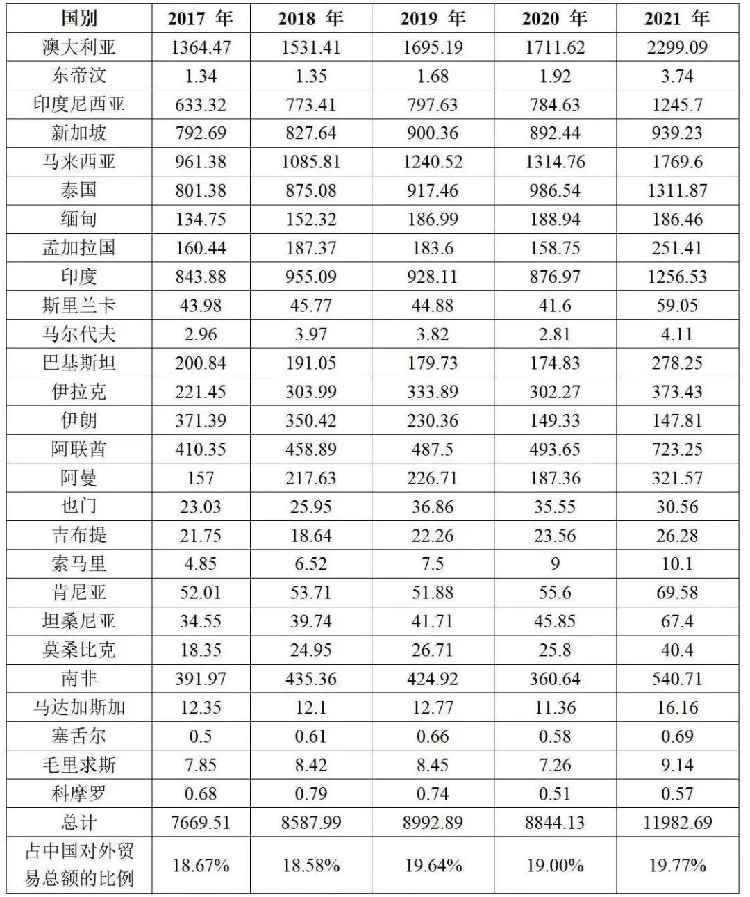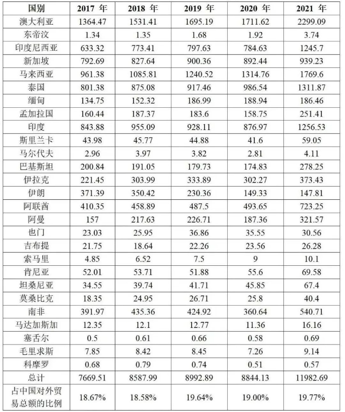 表1 2017-2021 年中國與印度洋沿岸各國貿(mào)易額 (單位:億美元)