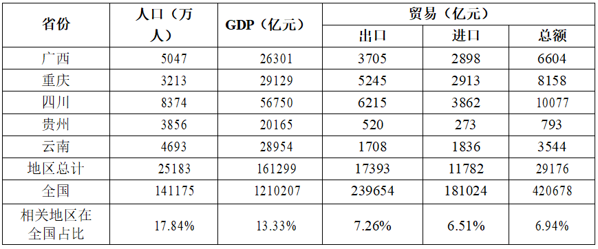 表2 西南國際大通道貫通相關(guān)地區(qū)2022年主要經(jīng)濟指標(biāo)