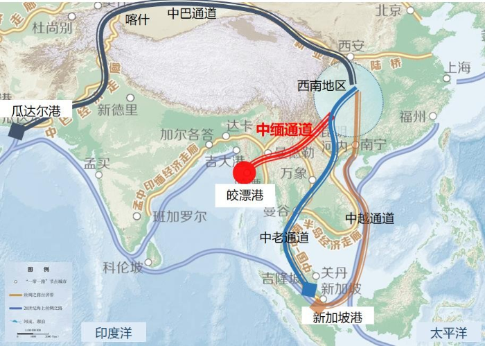 西南國際大通道起于我國的成渝地區(qū),途經(jīng)昆明經(jīng)德宏出境后直抵緬甸皎漂港,輻射南亞、印度與非洲等環(huán)印度洋板塊。西南國際大通道包括鐵路、公路、水運、航空、管道、能源、光纜等“七位一體”通道和經(jīng)貿(mào)走廊,是跨過馬六甲海峽直接溝通印度洋,輻射歐、非板塊的重要國際公共基礎(chǔ)設(shè)施,是聯(lián)通環(huán)印度洋的關(guān)鍵設(shè)施。西南國際大通道是中國西南部地區(qū)和印度洋沿岸,乃至西亞、非洲最便捷的貿(mào)易通道, 通道的開通將給沿線國家和地區(qū)發(fā)展帶來前所未有的歷史機遇[1]。