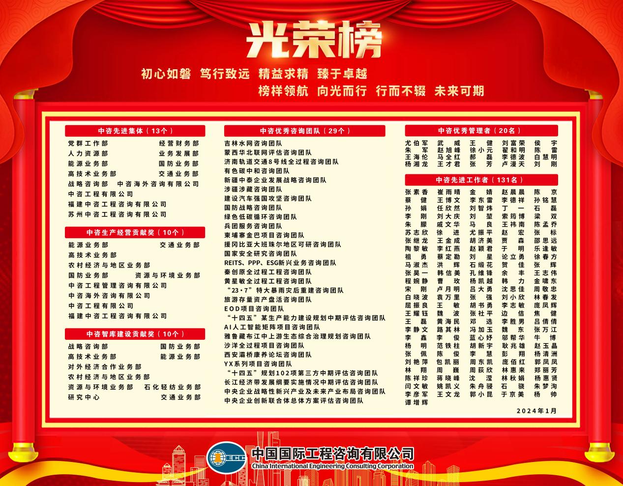 會(huì)議指出,2023年,公司深入開(kāi)展習(xí)近平新時(shí)代中國(guó)特色社會(huì)主義思想主題教育,堅(jiān)定不移落實(shí)“五五戰(zhàn)略”,加快建設(shè)國(guó)家高端智庫(kù)和世界一流咨詢機(jī)構(gòu),在服務(wù)中央科學(xué)決策和國(guó)家重大戰(zhàn)略方面做出突出貢獻(xiàn),核心功能和核心競(jìng)爭(zhēng)力更加凸顯,圓滿完成國(guó)資委各項(xiàng)考核指標(biāo)。公司咨詢服務(wù)工作得到委托方高度認(rèn)可,收到中央部委、地方政府、大型企事業(yè)單位等各方感謝信240封,100多名個(gè)人和團(tuán)隊(duì)受到表?yè)P(yáng)。公司榮獲菲迪克“卓越工程項(xiàng)目獎(jiǎng)”“優(yōu)秀工程項(xiàng)目獎(jiǎng)”各1項(xiàng)、魯班獎(jiǎng)4項(xiàng)、國(guó)家優(yōu)質(zhì)工程獎(jiǎng)9項(xiàng),獲得“2023年度誠(chéng)信經(jīng)營(yíng)守信踐諾標(biāo)桿企業(yè)”榮譽(yù)稱號(hào)。