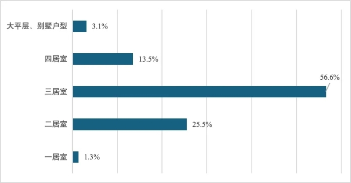 一是商品住房需求部分,在新房和二手房價格普遍下跌的趨勢下,青年購房需求出現(xiàn)分化。調(diào)查顯示,首先,部分青年群體受就業(yè)市場挑戰(zhàn)、婚育情況變化等因素影響,難以承受商品房價格,也避免承擔(dān)長期的房貸負(fù)擔(dān);其次,部分青年在擁有一定購房實力時,仍然選擇租房居住、持幣待購,規(guī)避房價下跌過程中家庭資產(chǎn)損失的風(fēng)險;再次,部分具有經(jīng)濟實力的青年群體開始關(guān)注居住環(huán)境的改善,《2023年青年置業(yè)報告》顯示,改善居住環(huán)境已經(jīng)成為青年置業(yè)的主要動力,如下圖1所示,46.7%的受訪青年為了改善居住環(huán)境而購房。同時,如下圖2所示,56.6%的受訪青年愿意購買三居室。因此,在商品房部分應(yīng)進一步關(guān)注青年群體分化的購房需求,繼續(xù)打造更加精準(zhǔn)的支持政策和供給產(chǎn)品。