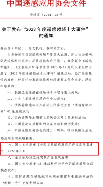 《中國衛(wèi)星遙感及應用產業(yè)發(fā)展藍皮書(2022年)》是我國首次對中國衛(wèi)星遙感及應用產業(yè)國民經濟貢獻度的定量化呈現,對于有效支撐政府主管部門的投資決策和指導商業(yè)航天發(fā)展、引導社會資本參與航天事業(yè)等都具有重大意義,是衛(wèi)星遙感及應用產業(yè)高質量發(fā)展的重要里程碑?!皣鴥仁状伟l(fā)布《中國衛(wèi)星遙感及應用產業(yè)發(fā)展藍皮書(2022年)》” 入選中國遙感應用協會評選的“2023年度遙感領域十大事件”。