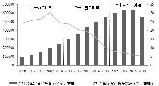 隨著我國經(jīng)濟(jì)從高速增長轉(zhuǎn)向中高速增長,拉動(dòng)經(jīng)濟(jì)增長的“三駕馬車”——投資、消費(fèi)和出口三者的貢獻(xiàn)程度也發(fā)生了變化,尤其是以消費(fèi)為主導(dǎo)的內(nèi)需逐漸成為穩(wěn)增長的重要支撐,而投資的貢獻(xiàn)有所減弱。究其原因,是因?yàn)榻陙硗顿Y增速持續(xù)回落。“十一五”末,我國全社會(huì)固定資產(chǎn)投資(以下簡稱“全社會(huì)投資”)沖高回落,2010年增速降至30%以內(nèi)?!笆濉睍r(shí)期,全社會(huì)投資增速持續(xù)下行,2013年增速跌破20%?!笆濉币詠?,全社會(huì)投資增速在低位徘徊,2016年增速降至個(gè)位數(shù),2019年全社會(huì)投資只比上年增長5.1%(見圖1)。對此,國家陸續(xù)出臺(tái)了一系列穩(wěn)投資的舉措,不僅將穩(wěn)投資作為“六穩(wěn)”工作的重要方面,而且強(qiáng)調(diào)投資對優(yōu)化供給結(jié)構(gòu)發(fā)揮關(guān)鍵性作用、提升我國長期綜合競爭實(shí)力具有重要意義。