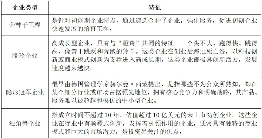 在2020前后,北京市經(jīng)開區(qū)曾提出一套頗為形象的創(chuàng)新企業(yè)發(fā)展路徑,即打造“金種子—展翼—瞪羚—專精特新—小巨人—隱形冠軍—獨角獸”創(chuàng)新企業(yè)梯隊,形成具有經(jīng)開區(qū)特色的創(chuàng)新“雁陣”體系(見表1)。