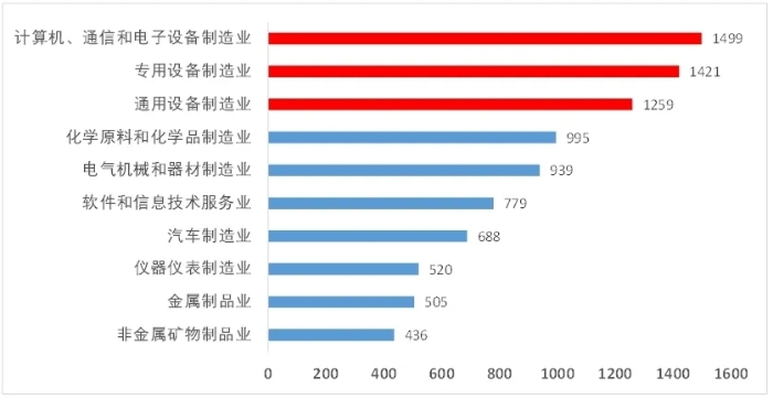 從行業(yè)來看[2],專精特新“小巨人”企業(yè)集中在制造業(yè)、科技創(chuàng)新以及人工智能等領(lǐng)域。專精特新“小巨人”企業(yè)分布前10行業(yè)分別是計算機、通信和電子設(shè)備制造業(yè)、專用設(shè)備制造業(yè)、通用設(shè)備制造業(yè)、化學(xué)原料和化學(xué)品制造、電氣機械和器材制造業(yè)、軟件和信息技術(shù)服務(wù)業(yè)、汽車制造業(yè)、儀器儀表制造業(yè)、金屬制品業(yè)、非金屬礦物制品業(yè)(見圖2)。