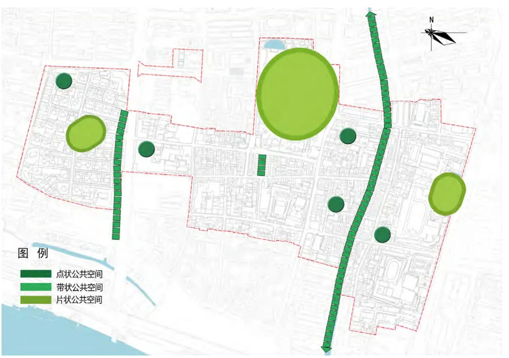 古城臨近宋河水系,周邊有山體公園、濱江公園以及小游園,開放空間類型較豐富(圖4)。目前只有中山公園的1公里服務范圍全覆蓋了古城規(guī)劃地區(qū),基本滿足“500米見綠、1000米達園”的綠地布局要求,和構建“園在城中、城在園中、城園一體、園城共融”的現(xiàn)代田園型都市的目標。