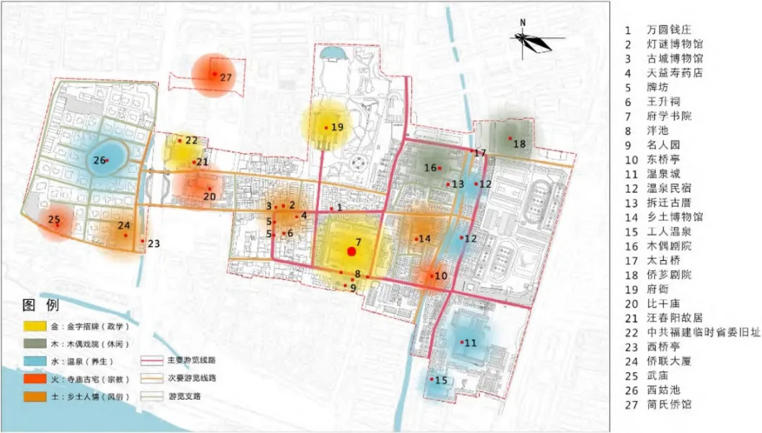 深入挖掘漳州古城內歷史文化資源,保留漳州古城整體風貌與建筑特色,進行改造升級。首先,梳理古城內歷史建筑,識別和提取其中蘊含的金、木、水、火、土文化基因[8],進行保護、修繕和再利用。其中,金主要為府衙、文廟等政府和文化建筑,木主要為木偶戲院等休閑建筑,水主要為溫泉等養(yǎng)生建筑,火主要為寺廟古宅等宗教建筑,土主要為體現(xiàn)鄉(xiāng)土人情的風俗建筑。其次,對服務、餐飲、購物等傳統(tǒng)業(yè)態(tài)進行升級,并植入展覽、體驗等新興業(yè)態(tài)。最后,組織主要和次要游覽線路。從點、線、面三個不同層次實現(xiàn)整個古城的活化與發(fā)展(圖7),最終將其打造成為閩南地區(qū)的特色文化名片。