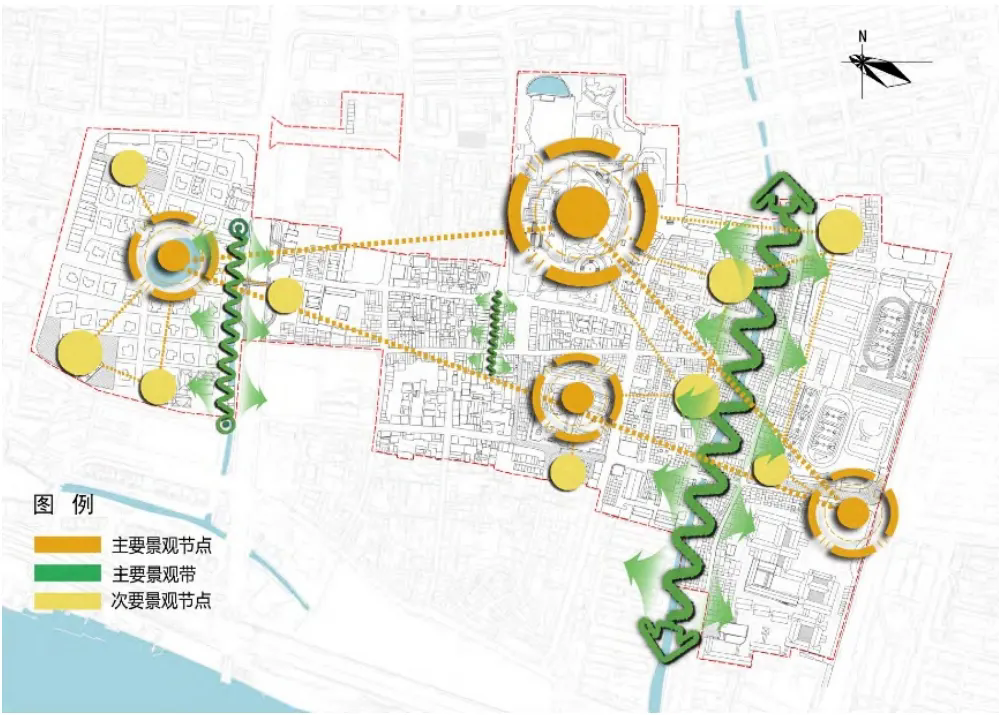 提取宋河在漳州古城歷史演變中的重要組成要素,充分利用宋河水系兩岸景觀及豐富的地熱溫泉資源,亮出宋河沿岸景觀,并通過打造溫泉體驗特色聚集人氣,重現(xiàn)“至誠無息,博厚悠遠”的宋河古韻。以中山公園、僑村西姑池、文廟等主要景觀要素形成主要景觀節(jié)點,結合街巷空間和開放空間形成次要景觀節(jié)點,強化宋河兩岸的景觀空間營造形成景觀帶,以主帶次、點帶連片,形成相互聯(lián)系、相互滲透的有機景觀結構系統(tǒng)(圖9)。