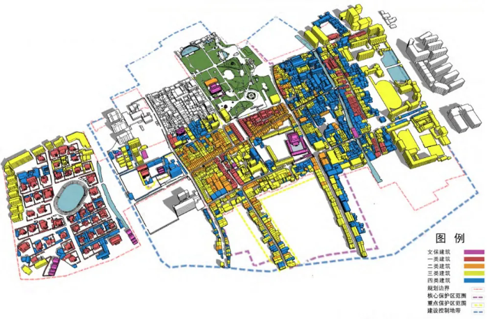 對現(xiàn)狀歷史建筑的建筑風貌、建筑質量、歷史意義等因素進行評估,將建筑分為文保建筑、一類建筑、二類建筑、三類建筑、四類建筑五類。其中,文保建筑為極具歷史價值、意義重大的建筑;一類建筑為風貌完好、質量上佳的建筑;二類建筑為風貌尚可、質量稍差的建筑;三類建筑為風貌較差、質量不佳的建筑;四類建筑為風貌極差、質量極差的建筑??梢钥吹剑懦侵行膮^(qū)內歷史建筑整體保存較好,外圍區(qū)域保存較差,可有針對性地進行建筑風貌恢復、整理工作。