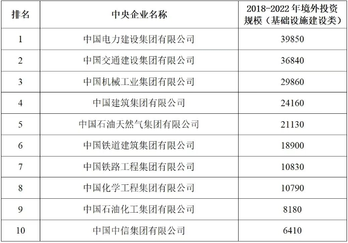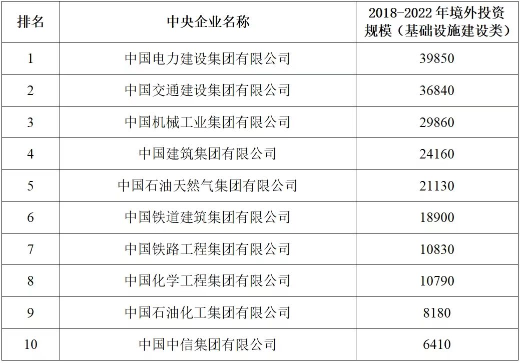 近5年來(lái),我國(guó)中央企業(yè)基礎(chǔ)設(shè)施建設(shè)類(lèi)境外投資規(guī)模排名前5的企業(yè)分別為中國(guó)電力建設(shè)集團(tuán)有限公司(以下簡(jiǎn)稱(chēng)中國(guó)電建)、中交集團(tuán)、中國(guó)機(jī)械工業(yè)集團(tuán)有限公司(以下簡(jiǎn)稱(chēng)國(guó)機(jī)集團(tuán))、中國(guó)建筑集團(tuán)有限公司(以下簡(jiǎn)稱(chēng)中建集團(tuán))和中國(guó)石油天然氣集團(tuán)有限公司(以下簡(jiǎn)稱(chēng)中國(guó)石油),投資額分別為398.5億美元、368.4億美元、298.6億美元、241.6億美元和211.3億美元。