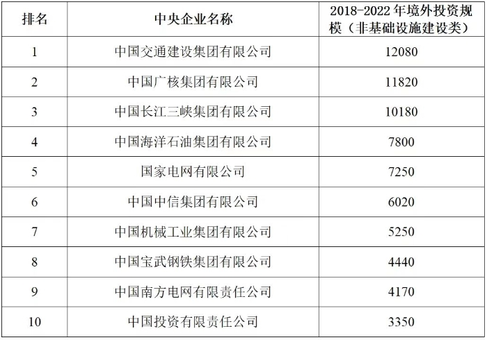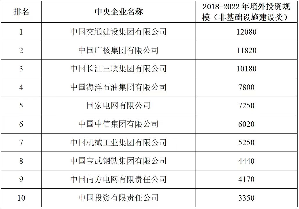本文對(duì)2018年1月-2022年12月我國(guó)中央企業(yè)境外投資的非基礎(chǔ)設(shè)施類(lèi)和基礎(chǔ)設(shè)施類(lèi)投資分別進(jìn)行了統(tǒng)計(jì),表2和表3分別列出了非基建和基建類(lèi)境外投資規(guī)模居于前10的企業(yè)。近5年來(lái),我國(guó)中央企業(yè)非基礎(chǔ)設(shè)施建設(shè)類(lèi)境外投資規(guī)模排名前5的企業(yè)分別為中國(guó)交通建設(shè)集團(tuán)有限公司(以下簡(jiǎn)稱(chēng)中交集團(tuán))、中國(guó)廣核集團(tuán)有限公司(以下簡(jiǎn)稱(chēng)中廣核集團(tuán))、中國(guó)長(zhǎng)江三峽集團(tuán)有限公司(以下簡(jiǎn)稱(chēng)三峽集團(tuán))、中國(guó)海洋石油集團(tuán)有限公司(以下簡(jiǎn)稱(chēng)中國(guó)海油)和國(guó)家電網(wǎng)有限公司(以下簡(jiǎn)稱(chēng)國(guó)家電網(wǎng)),投資額分別為120.8億美元、118.2億美元、101.8億美元、78億美元和72.5億美元。