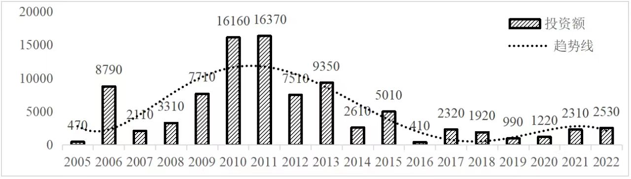 2005-2022年中央企業(yè)金屬行業(yè)境外投資情況見(jiàn)圖6。分析發(fā)現(xiàn),金屬行業(yè)2007年達(dá)到投資峰值,此后逐年下降。