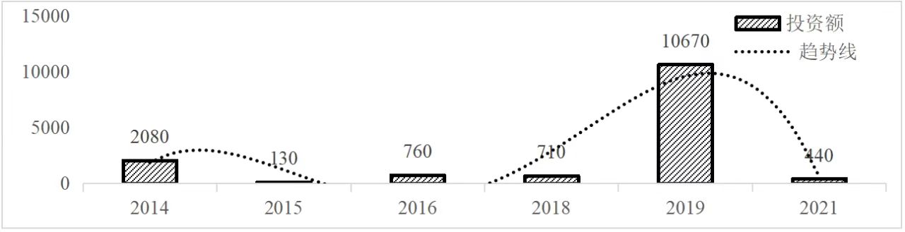 2005-2022年中央企業(yè)旅游業(yè)境外投資情況見(jiàn)圖8。分析發(fā)現(xiàn),旅游業(yè)在2014-2019年間整體呈現(xiàn)較為平穩(wěn)的對(duì)外投資規(guī)模,2019年后暫無(wú)相關(guān)對(duì)外投資。