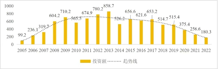 圖1 2005-2022年中央企業(yè)境外投資規(guī)模 單位:億美元