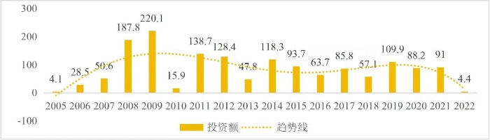 2005-2022年中國(guó)石化境外投資情況見(jiàn)圖10。