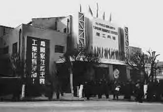 鞍山市中心人民劇院會場,門前是象征建設(shè)“基礎(chǔ)”的4個巨大的紅色方柱子,上面矗立著象征偉大建設(shè)的灰色鋼架建筑物;用高爐和無縫鋼管、重軌圖案組成的“三大工程”竣工紀念章模型,在會場門前的墻上發(fā)出金色的光輝。主席臺的兩側(cè)掛著中國共產(chǎn)黨中央委員會和中央人民政府給大型軋鋼廠、無縫鋼管廠和7號高爐竣工典禮的紀念錦旗以及周恩來總理給大會的題詞。