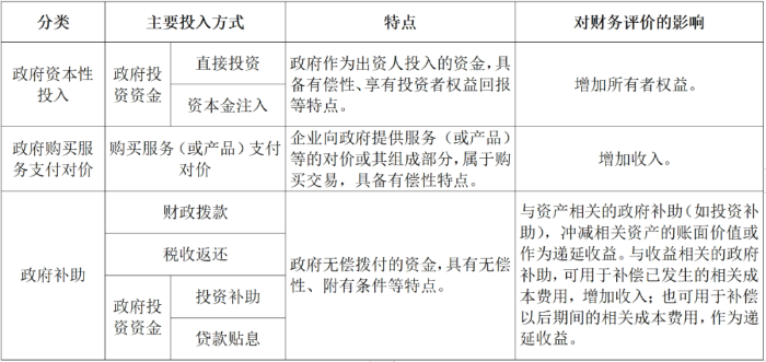按照政府宏觀調(diào)控需要以及投資項目的項目性質(zhì)、運營模式和盈利能力,政府性資金主要包括政府資本性投入、政府購買服務(wù)支付對價和政府補助等類型。