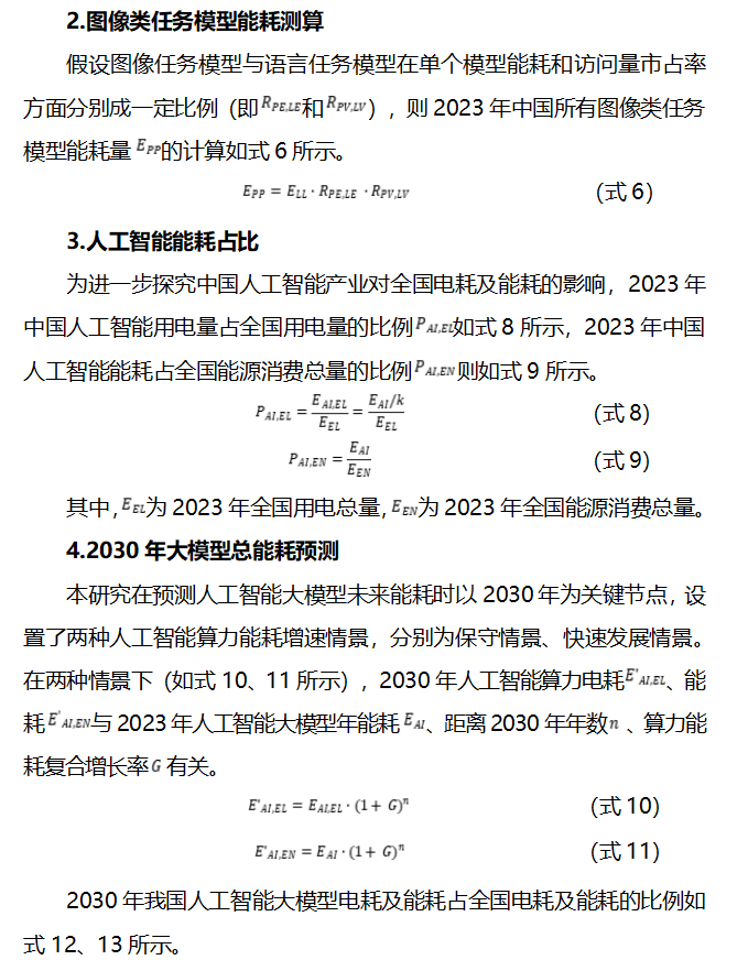 摘要:人工智能大模型技術(shù)引領(lǐng)的新興產(chǎn)業(yè)發(fā)展正成為全球新一輪科技革命和產(chǎn)業(yè)競(jìng)爭(zhēng)的新高地、新賽道。我國牢牢把握這一戰(zhàn)略機(jī)遇,推動(dòng)新一代人工智能模型成為新質(zhì)生產(chǎn)力的典型代表,實(shí)現(xiàn)全產(chǎn)業(yè)高質(zhì)量發(fā)展。然而,人工智能模型性能發(fā)展所依托的模型參數(shù)擴(kuò)張、訓(xùn)練次數(shù)升級(jí)以及伴隨著的使用頻率躍增,已然導(dǎo)致算力需求和能源消費(fèi)過快增長。在當(dāng)前嚴(yán)峻的節(jié)能形勢(shì)背景下,人工智能的能耗問題與節(jié)能工作之間的潛在矛盾備受關(guān)注。鑒于此,本文對(duì)人工智能的能耗影響及挑戰(zhàn)進(jìn)行了測(cè)算分析,認(rèn)為人工智能產(chǎn)業(yè)能耗的長期影響總體可控,但短期局部影響仍然突出,或與節(jié)能工作形成沖突,建議從強(qiáng)化產(chǎn)業(yè)發(fā)展要素保障、摸排產(chǎn)業(yè)發(fā)展情況、建立綠色低碳管理機(jī)制、深化“東數(shù)西算”格局四個(gè)方面,推動(dòng)人工智能產(chǎn)業(yè)綠色低碳發(fā)展。 一、研究背景 以大模型為代表的人工智能技術(shù)和產(chǎn)業(yè)已成為當(dāng)今經(jīng)濟(jì)社會(huì)發(fā)展的重要支撐,發(fā)展新一代人工智能大模型是加快形成新質(zhì)生產(chǎn)力、培育經(jīng)濟(jì)發(fā)展新動(dòng)能、贏得全球科技競(jìng)爭(zhēng)主動(dòng)權(quán)的戰(zhàn)略抓手。自2020年起,人工智能由傳統(tǒng)的“判別式小模型”轉(zhuǎn)向更為先進(jìn)的“生成式大模型”,代表性功能也從人臉識(shí)別、目標(biāo)檢測(cè)、文本分類升級(jí)到如今的文本生成、圖像生成、語音生成、視頻生成等。 人工智能大模型計(jì)算系統(tǒng)通常由深度神經(jīng)網(wǎng)絡(luò)構(gòu)建而成,具有萬億量級(jí)參數(shù)規(guī)模和復(fù)雜計(jì)算結(jié)構(gòu),能夠根據(jù)已學(xué)習(xí)的內(nèi)容進(jìn)行基礎(chǔ)性地判斷以及創(chuàng)造性地生成新內(nèi)容。其中,語言類和圖像類任務(wù)大模型應(yīng)用場(chǎng)景較為廣泛,正成為當(dāng)前人工智能技術(shù)研究和應(yīng)用的熱點(diǎn)方向。具體而言,語言類任務(wù)大模型主要用于理解和生成自然語言文本,處理諸如文本分類、問答系統(tǒng)、文字生成等文字任務(wù),代表性模型有OpenAI公司發(fā)布的ChatGPT、百度公司發(fā)布的文心一言等。圖像類任務(wù)大模型則主要用于處理和理解圖像內(nèi)容,執(zhí)行諸如圖像分類、目標(biāo)檢測(cè)、圖像生成等視覺任務(wù),代表性模型包括OpenAI公司的DALL-E、智譜人工智能研究院的CogVLM等。 隨著人工智能技術(shù)的快速發(fā)展,其背后的算力支撐和電力供應(yīng)變得愈發(fā)關(guān)鍵。算力,即單位時(shí)間內(nèi)處理數(shù)據(jù)或信息的能力(FLOPS),主要以計(jì)算機(jī)設(shè)備、數(shù)據(jù)中心、智算中心等算力基礎(chǔ)設(shè)施作為運(yùn)行載體,而電力則為其提供必要的能源支撐,以確保算力的穩(wěn)定高效運(yùn)行。由于人工智能技術(shù)的快速發(fā)展高度依賴于模型參數(shù)規(guī)模擴(kuò)大、訓(xùn)練次數(shù)升級(jí)以及伴隨著的使用頻率躍增,算力需求和能源消耗呈現(xiàn)快速增長態(tài)勢(shì),也由此引發(fā)了一系列關(guān)注。然而已有研究多聚焦于能耗總量分析,鮮有深入探討其時(shí)空分布特點(diǎn)以及結(jié)合節(jié)能工作形勢(shì)全面分析能耗挑戰(zhàn)。為此,本文以語言類和圖像類大模型兩類人工智能大模型為代表對(duì)人工智能能耗進(jìn)行了測(cè)算,并結(jié)合時(shí)空分布以及節(jié)能工作形勢(shì)分析了人工智能能耗帶來的挑戰(zhàn),最后從要素保障、產(chǎn)業(yè)摸底、管理機(jī)制、戰(zhàn)略格局等維度提出了政策建議,以期為我國人工智能產(chǎn)業(yè)綠色低碳發(fā)展提供有力支撐。 二、研究方法與數(shù)據(jù) 本研究基于人工智能領(lǐng)域相關(guān)政策文件、研究報(bào)告、學(xué)術(shù)文獻(xiàn)等最新信息,構(gòu)建了以語言類大模型和圖像類大模型能耗情況為代表的人工智能大模型能耗計(jì)算方法,并對(duì)我國人工智能發(fā)展的能耗影響進(jìn)行了測(cè)算分析。 (一)大模型總能耗現(xiàn)狀測(cè)算 當(dāng)前中國人工智能大模型總能耗主要由語言類大模型總能耗和圖像類大模型總能耗構(gòu)成(受限于數(shù)據(jù)可得性,以2023年大模型發(fā)展情況對(duì)其能耗水平現(xiàn)狀進(jìn)行測(cè)算),如式1所示: (二)數(shù)據(jù)來源 計(jì)算過程的參數(shù)設(shè)置與數(shù)據(jù)來源如下表所示。在人工智能大模型能耗現(xiàn)狀計(jì)算方面,主要參數(shù)包括每天訪問人數(shù)、人均問題數(shù)、問題平均字?jǐn)?shù)等。其中,每天訪問人數(shù)、語言類大模型訪問量市占率、圖像模型與語言模型訪問量市占率比例均來自非凡產(chǎn)研[1]的2024年度報(bào)告。單字平均GPU響應(yīng)時(shí)間數(shù)值來自Pointon(2022)[2],即0.35秒/字。根據(jù)Patterson等人[3]的研究結(jié)果,GPU功率為400瓦特?;贚uccioni & Jernite(2023)[4],語言類大模型訓(xùn)練和推斷階段的能耗比例為2:3,圖像任務(wù)能耗與語言任務(wù)能耗比例為30:1。中國現(xiàn)有大模型總數(s