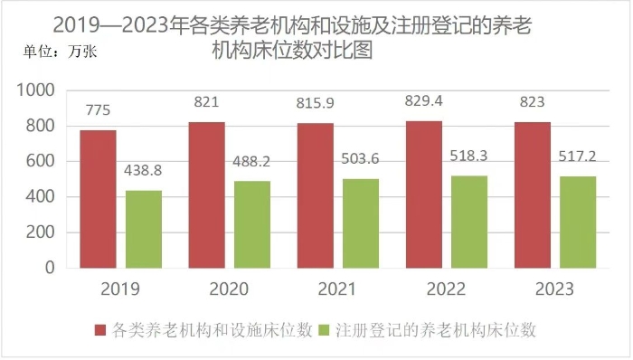圖2 2019-2023年各類養(yǎng)老機(jī)構(gòu)和設(shè)施及注冊(cè)登記的養(yǎng)老機(jī)構(gòu)床位數(shù)對(duì)比圖