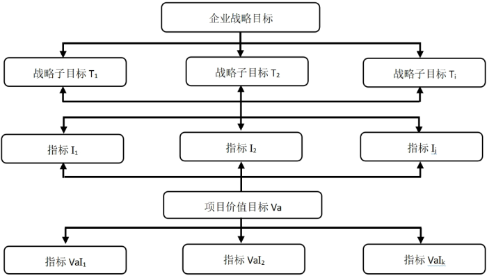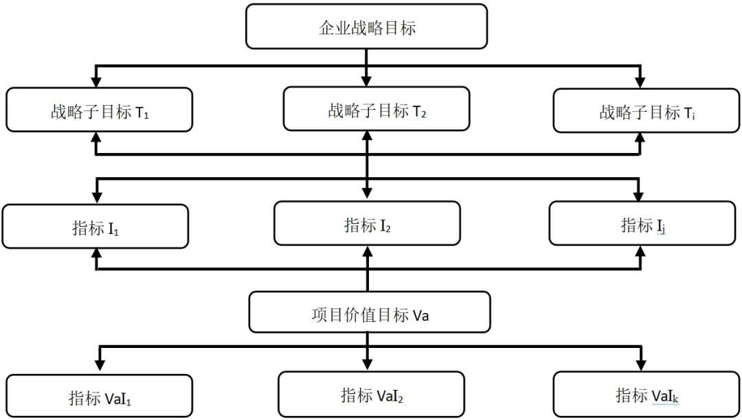 在現(xiàn)實(shí)決策中,企業(yè)戰(zhàn)略分解的各子戰(zhàn)略目標(biāo)可能直接對應(yīng)企業(yè)的各戰(zhàn)略板塊。對各子戰(zhàn)略目標(biāo)可以進(jìn)一步進(jìn)行項(xiàng)目化分解或指標(biāo)化分解,為項(xiàng)目的決策和項(xiàng)目目標(biāo)(價值)的設(shè)計提供依據(jù)。同樣的,在項(xiàng)目目標(biāo)(價值)設(shè)計時,應(yīng)在策劃階段形成的項(xiàng)目建議書、投資估算等基礎(chǔ)上,對項(xiàng)目進(jìn)行綜合分析、論證,將項(xiàng)目目標(biāo)(價值)分解,并逐一設(shè)定明確的指標(biāo),并將項(xiàng)目指標(biāo)落實(shí)到具體的工作和項(xiàng)目人員上。