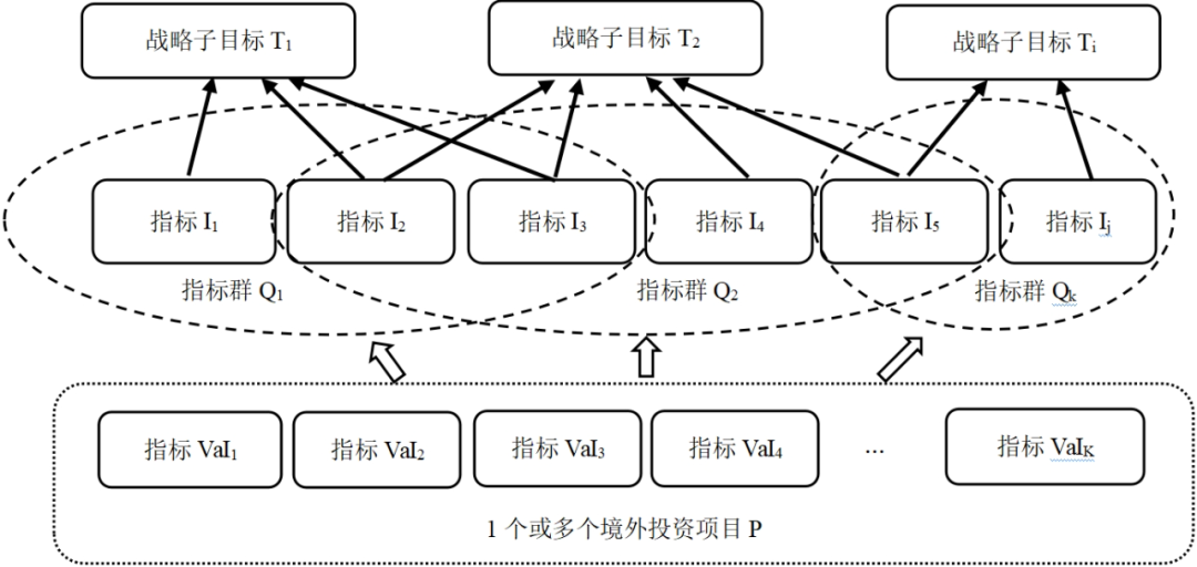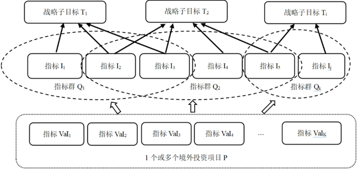 在項(xiàng)目啟動階段,決策者需要判斷每個項(xiàng)目對企業(yè)戰(zhàn)略的貢獻(xiàn)度,從而對項(xiàng)目進(jìn)行決策和進(jìn)一步規(guī)劃和管理。項(xiàng)目的規(guī)劃和管理是企業(yè)戰(zhàn)略的具體落實(shí),隨著項(xiàng)目啟動,意味著企業(yè)戰(zhàn)略在項(xiàng)目層面具體實(shí)施的開始。項(xiàng)目具體指標(biāo)的設(shè)置應(yīng)對項(xiàng)目的價值目標(biāo)負(fù)責(zé),應(yīng)符合項(xiàng)目的預(yù)期目標(biāo),并為戰(zhàn)略管理和戰(zhàn)略實(shí)現(xiàn)階段的效果評價提供標(biāo)準(zhǔn)。項(xiàng)目啟動階段的決策將直接影響項(xiàng)目對企業(yè)戰(zhàn)略實(shí)現(xiàn)的貢獻(xiàn)度,也將在很大程度上決定項(xiàng)目最終是否能夠成功實(shí)現(xiàn)項(xiàng)目層級的價值目標(biāo)。因此本文的基本思路是將企業(yè)戰(zhàn)略目標(biāo)轉(zhuǎn)化為項(xiàng)目價值目標(biāo),再細(xì)分為具體的項(xiàng)目指標(biāo),實(shí)現(xiàn)對項(xiàng)目實(shí)現(xiàn)企業(yè)戰(zhàn)略的定量評價,從而做出符合企業(yè)戰(zhàn)略目標(biāo)的項(xiàng)目決策,真正實(shí)現(xiàn)企業(yè)戰(zhàn)略引領(lǐng)的境外投資模式。