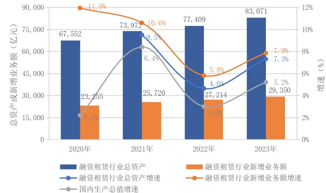 租賃,是指在一定期間內(nèi)出租方將資產(chǎn)的使用權(quán)讓與承租方以獲取對價(jià)的行為,分為融資租賃和經(jīng)營租賃。其中,融資租賃是指實(shí)質(zhì)上轉(zhuǎn)移了與租賃資產(chǎn)所有權(quán)有關(guān)的幾乎全部風(fēng)險(xiǎn)和報(bào)酬的租賃,承租方對資產(chǎn)剩余價(jià)值的索取程度高[1];經(jīng)營租賃是指除融資租賃以外的其他租賃,承租方僅以獲取資產(chǎn)的使用權(quán)為目的。目前,我國已成為世界第二大金融租賃市場。以2023年數(shù)據(jù)為例,我國融資租賃行業(yè)新增業(yè)務(wù)額約2.9萬億元,同比上漲7.9%,總資產(chǎn)規(guī)模8.3萬億元,同比上漲7.3%,均約為同期GDP增速的1.4倍(詳見圖1);同時(shí)隨著城市化進(jìn)程的推進(jìn)和基礎(chǔ)設(shè)施建設(shè)的需求增加,設(shè)備和房地產(chǎn)等經(jīng)營租賃市場的規(guī)模也在不斷擴(kuò)大。
