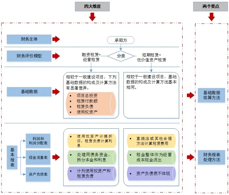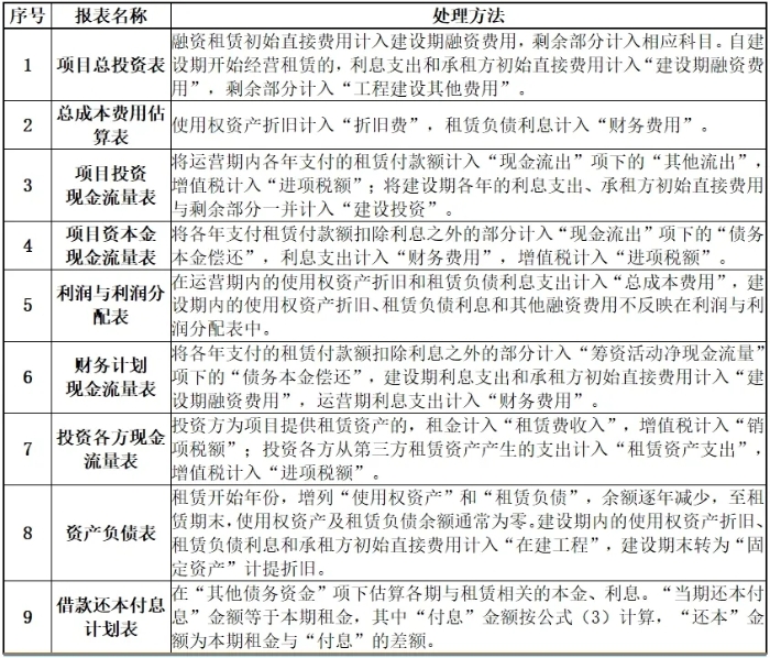 承租方融資租賃和經(jīng)營租賃均為表內(nèi)融資方式,租金拆分為利息及本金,分別計(jì)入財(cái)務(wù)費(fèi)用和債務(wù)本金償還;財(cái)務(wù)報(bào)表反映租賃資產(chǎn),分別計(jì)入使用權(quán)資產(chǎn)和租賃負(fù)債,與一般建設(shè)項(xiàng)目財(cái)務(wù)報(bào)表的列項(xiàng)構(gòu)成、確認(rèn)依據(jù)、計(jì)算方法等有較大差異。