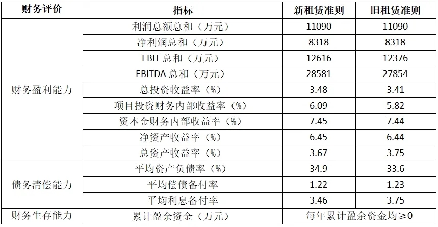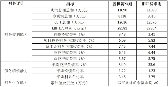 新舊租賃準(zhǔn)則下的各年利潤總額和凈利潤總和相等。但由于新租賃準(zhǔn)則下,租賃整體確認(rèn)為使用權(quán)資產(chǎn)和租賃負(fù)債,分別以使用權(quán)資產(chǎn)折舊和利息支出的方式計(jì)入總成本費(fèi)用,息稅前利潤(EBIT)、息稅折舊及攤銷前利潤(EBITDA)及以EBIT為基礎(chǔ)計(jì)算的總投資收益率等指標(biāo)均高于舊租賃準(zhǔn)則。同時(shí),隨著租金的逐期支付,每年利息金額呈現(xiàn)先高后低趨勢,凈資產(chǎn)收益率等靜態(tài)盈利能力指標(biāo)趨勢則反之;此外所得稅呈現(xiàn)先低后高趨勢,導(dǎo)致內(nèi)部收益率等動(dòng)態(tài)盈利能力指標(biāo)優(yōu)于舊租賃準(zhǔn)則,詳見表4。