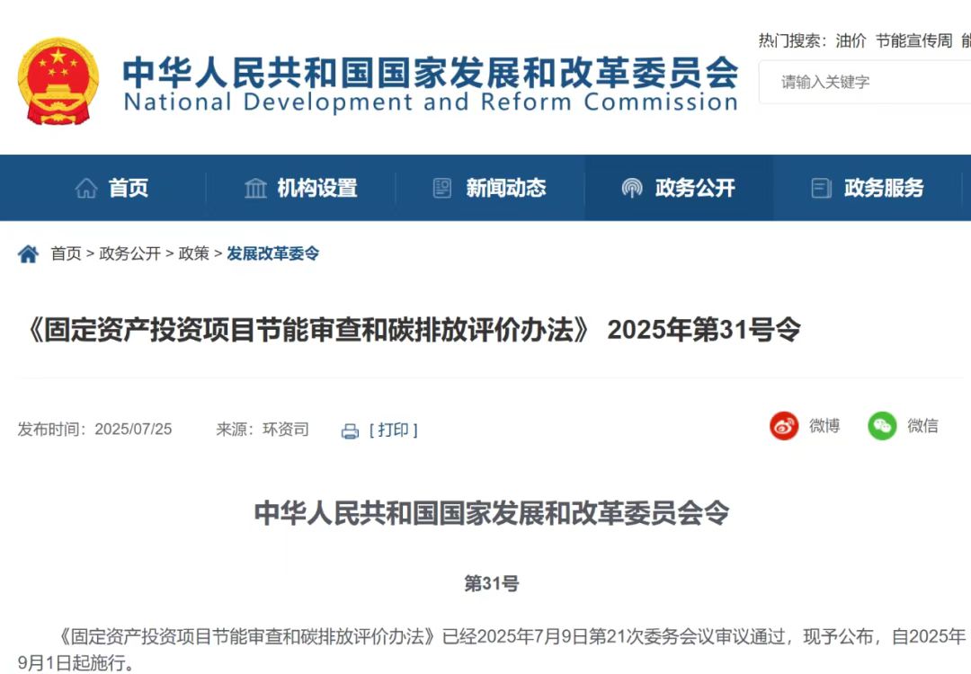 加強(qiáng)固定資產(chǎn)投資項(xiàng)目能源消費(fèi)和碳排放管理 有力支撐節(jié)能降碳工作取得新的更大成效 張英健 論立勇 加強(qiáng)固定資產(chǎn)投資項(xiàng)目節(jié)能審查和碳排放評(píng)價(jià)是有力有效遏制“兩高”項(xiàng)目盲目上馬、推動(dòng)綠色低碳高質(zhì)量發(fā)展的一項(xiàng)重要舉措。近日,國(guó)家發(fā)展改革委頒布《固定資產(chǎn)投資項(xiàng)目節(jié)能審查和碳排放評(píng)價(jià)辦法》(國(guó)家發(fā)展和改革委員會(huì)令2025年第31號(hào),以下簡(jiǎn)稱《辦法》),這是適應(yīng)新形勢(shì)新任務(wù)新要求、扎實(shí)做好節(jié)能降碳工作的重要制度安排,對(duì)建立能耗雙控向碳排放雙控全面轉(zhuǎn)型新機(jī)制、積極穩(wěn)妥推進(jìn)碳達(dá)峰碳中和具有重要意義。 01 節(jié)能審查工作邁入新階段 新上固定資產(chǎn)投資項(xiàng)目作為全社會(huì)能源消費(fèi)增長(zhǎng)的主要驅(qū)動(dòng)因素之一,是推動(dòng)節(jié)能降碳工作的重要“戰(zhàn)場(chǎng)”。自2010年節(jié)能審查制度建立實(shí)施以來(lái),這項(xiàng)制度在提高新上項(xiàng)目能源利用效率、從源頭減少不合理能源消費(fèi)和碳排放、推動(dòng)產(chǎn)業(yè)結(jié)構(gòu)優(yōu)化升級(jí)、推廣先進(jìn)節(jié)能降碳工藝技術(shù)裝備等方面都發(fā)揮了重要作用。 作為全球最大的發(fā)展中國(guó)家,未來(lái)一個(gè)時(shí)期,我國(guó)能源消費(fèi)和碳排放還將保持增長(zhǎng)態(tài)勢(shì),實(shí)現(xiàn)碳達(dá)峰目標(biāo)時(shí)間窗口緊、任務(wù)重,需要付出艱苦努力。今年是“十四五”收官和“十五五”謀劃的關(guān)鍵節(jié)點(diǎn),面對(duì)新形勢(shì)新任務(wù)新要求,《辦法》將項(xiàng)目碳排放評(píng)價(jià)納入節(jié)能審查制度,上收重點(diǎn)領(lǐng)域重大項(xiàng)目節(jié)能審查權(quán)限,細(xì)化節(jié)能審查事中事后監(jiān)管要求,進(jìn)一步健全相關(guān)規(guī)定、補(bǔ)齊制度短板,及時(shí)明確了新形勢(shì)下節(jié)能審查工作“怎么干”的問(wèn)題,對(duì)更好加強(qiáng)節(jié)能審查和碳排放評(píng)價(jià)源頭把關(guān)、推動(dòng)節(jié)能降碳工作邁上新臺(tái)階具有重要意義。 02 細(xì)化明確碳排放評(píng)價(jià)工作要求 2023年3月修訂發(fā)布的《固定資產(chǎn)投資項(xiàng)目節(jié)能審查辦法》(國(guó)家發(fā)展和改革委員會(huì)令2023年第2號(hào))要求具備碳排放統(tǒng)計(jì)核算條件的項(xiàng)目,應(yīng)在節(jié)能報(bào)告中增加碳排放有關(guān)情況及對(duì)所在地區(qū)完成降碳目標(biāo)任務(wù)的影響等內(nèi)容。在此基礎(chǔ)上,《辦法》按照《加快構(gòu)建碳排放雙控制度體系工作方案》(國(guó)辦發(fā)〔2024〕39號(hào))中“將碳排放評(píng)價(jià)有關(guān)要求納入固定資產(chǎn)投資項(xiàng)目節(jié)能審查,對(duì)項(xiàng)目用能和碳排放情況開展綜合評(píng)價(jià)”等要求,進(jìn)一步強(qiáng)化項(xiàng)目能源消費(fèi)和碳排放管理工作導(dǎo)向,加強(qiáng)節(jié)能審查制度與碳排放雙控制度體系的有效銜接。 《辦法》要求將碳排放總量、碳排放結(jié)構(gòu)、單位產(chǎn)品碳排放、單位增加值(產(chǎn)值)碳排放等指標(biāo),以及相關(guān)指標(biāo)與標(biāo)準(zhǔn)、行業(yè)先進(jìn)水平的比較等情況納入節(jié)能報(bào)告。同時(shí),進(jìn)一步明確碳排放評(píng)價(jià)具體工作要求,一方面將項(xiàng)目上馬對(duì)碳排放形勢(shì)和碳排放強(qiáng)度降低目標(biāo)完成的影響,以及單位產(chǎn)品和產(chǎn)值碳排放是否符合國(guó)家與行業(yè)標(biāo)準(zhǔn)、碳排放數(shù)據(jù)核算及分析論證是否準(zhǔn)確等作為審查評(píng)價(jià)重點(diǎn)內(nèi)容;另一方面,明確國(guó)家發(fā)展改革委實(shí)施節(jié)能審查的項(xiàng)目需同步開展碳排放評(píng)價(jià),并要求地方節(jié)能審查機(jī)關(guān)結(jié)合本地區(qū)實(shí)際對(duì)碳排放量大且可能對(duì)碳達(dá)峰形勢(shì)、碳排放強(qiáng)度降低目標(biāo)完成等產(chǎn)生不利影響的項(xiàng)目開展碳排放評(píng)價(jià)。相關(guān)規(guī)定為開展項(xiàng)目碳排放評(píng)價(jià)提供了具體指導(dǎo),有利于在源頭和入口形成有效的碳排放控制閥門。 03 優(yōu)化節(jié)能審查管理權(quán)限 近年來(lái),從地方實(shí)踐看,節(jié)能審查制度在實(shí)際執(zhí)行過(guò)程中還存在審查權(quán)限層層下放、審查質(zhì)量不高等問(wèn)題?!掇k法》堅(jiān)持問(wèn)題導(dǎo)向,加強(qiáng)制度創(chuàng)新,進(jìn)一步優(yōu)化節(jié)能審查管理權(quán)限,完善分級(jí)分類管理要求。在國(guó)家層面,建立節(jié)能審查權(quán)限動(dòng)態(tài)調(diào)整機(jī)制,國(guó)家發(fā)展改革委統(tǒng)籌考慮節(jié)能降碳形勢(shì)、行業(yè)發(fā)展情況等因素,對(duì)重點(diǎn)領(lǐng)域年綜合能源消費(fèi)量50萬(wàn)噸標(biāo)準(zhǔn)煤及以上(或年煤炭消費(fèi)量50萬(wàn)噸及以上)項(xiàng)目實(shí)施節(jié)能審查;在地方層面,省級(jí)節(jié)能審查機(jī)關(guān)負(fù)責(zé)對(duì)年綜合能源消費(fèi)量1萬(wàn)噸標(biāo)準(zhǔn)煤及以上(或年煤炭消費(fèi)量1萬(wàn)噸
