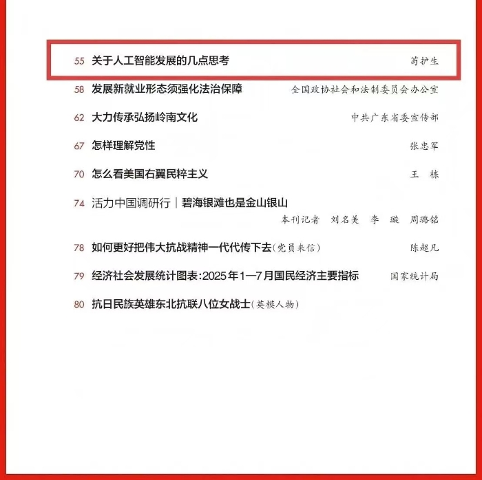 編者按:9月1日出版的2025年第17期《求是》雜志刊發(fā)公司黨委書記、董事長茍護(hù)生同志理論文章《關(guān)于人工智能發(fā)展的幾點(diǎn)思考》,文章立足全球人工智能發(fā)展浪潮,緊扣我國人工智能產(chǎn)業(yè)實際,以辯證思維深入剖析創(chuàng)新與開放、發(fā)展與安全、政府與市場、應(yīng)用與治理的內(nèi)在邏輯關(guān)系,在搶抓人工智能發(fā)展機(jī)遇、直面技術(shù)應(yīng)用風(fēng)險挑戰(zhàn)中,為推動人工智能與經(jīng)濟(jì)社會深度融合、助力我國搶占全球科技競爭主動權(quán)提供了有益借鑒?,F(xiàn)予以轉(zhuǎn)載,供學(xué)習(xí)參考。