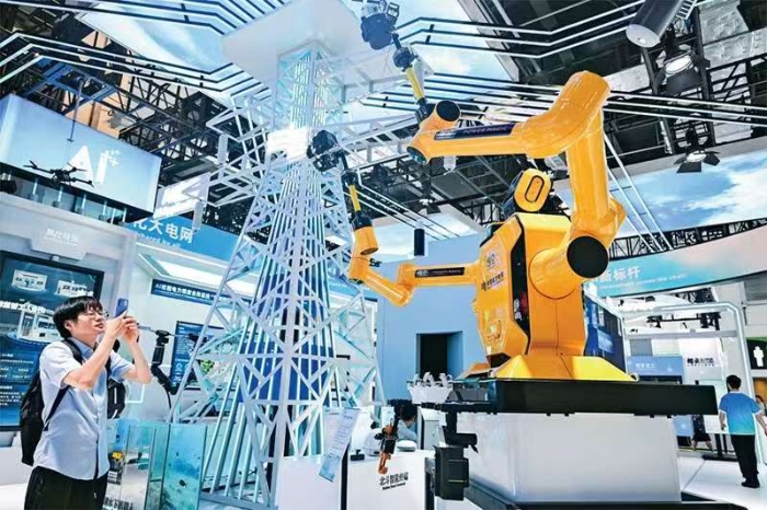 7月26日至28日,2025世界人工智能大會暨人工智能全球治理高級別會議在上海舉辦?!爸悄軙r代 同球共濟(jì)”的主題貫穿始終,為全球人工智能領(lǐng)域帶來一場思想與創(chuàng)新碰撞的盛宴。圖為參觀者在中國南方電網(wǎng)展區(qū)拍攝“悟空”帶電作業(yè)機(jī)器人。 新華社記者 陳浩明/攝
